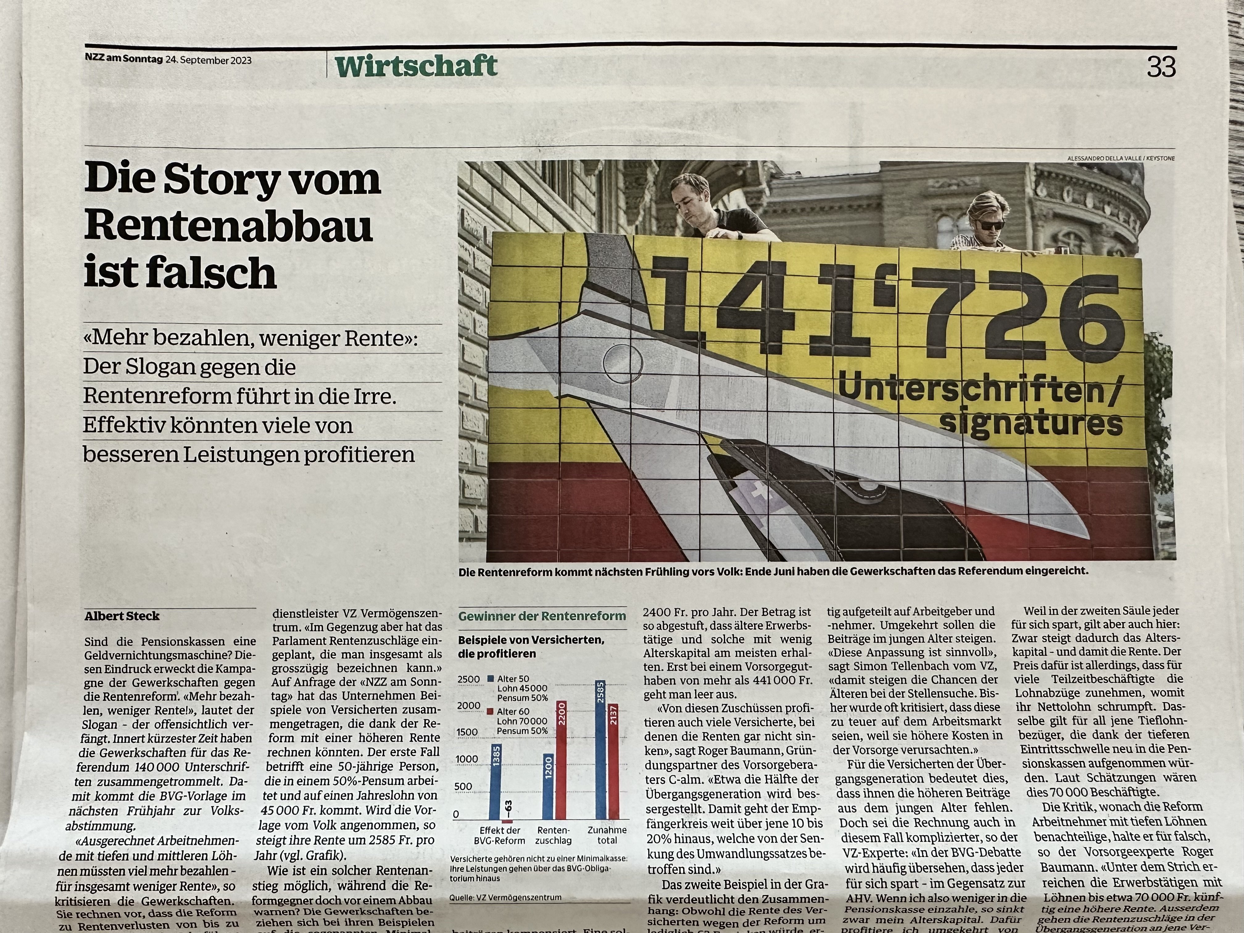 Die Rentenreform in der Schweiz sorgt für kontroverse Diskussionen. Albert Steck analysiert in der heutigen NZZ am Sonntag die Warnung der Gewerkschaften mit dem Slogan "Mehr bezahlen, weniger Rente!".